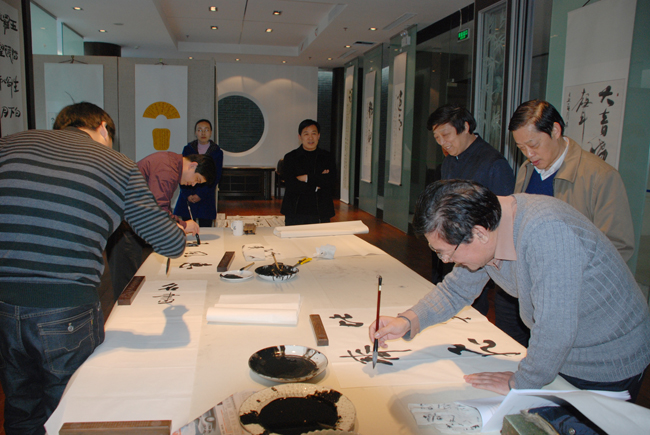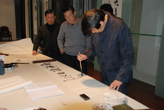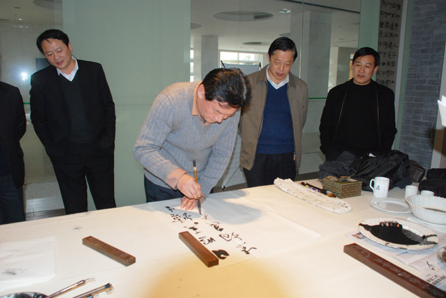 12月4月,中國書(shū)法家協(xié)會(huì )會(huì )員、山東平邑縣書(shū)法家協(xié)會(huì )副主席徐修,中國書(shū)法家協(xié)會(huì )會(huì )員、山東淄博中國畫(huà)院院長(cháng)、淄博市張居區書(shū)協(xié)主席張伯祥,中國書(shū)法家協(xié)會(huì )會(huì )員、河北黃驊市書(shū)協(xié)副主席陳慶亮齊聚濟川藥業(yè),參加濟川藥業(yè)書(shū)畫(huà)院舉辦的書(shū)法藝術(shù)交流筆會(huì )。泰州藥監局局長(cháng)陳關(guān)華、濟川藥業(yè)董事長(cháng)曹龍祥等現場(chǎng)觀(guān)摩書(shū)法名家運筆風(fēng)采。