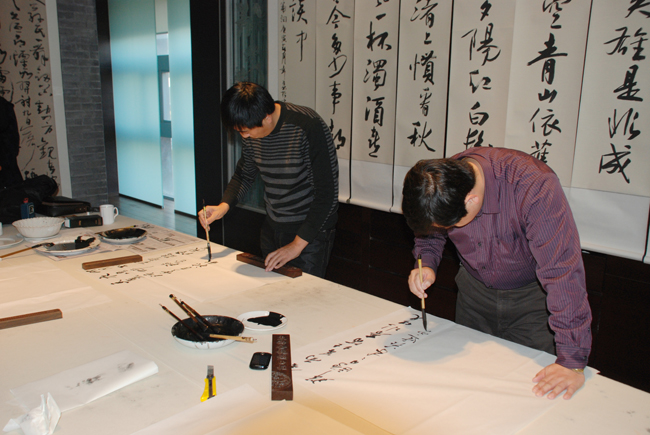 中國書(shū)法家協(xié)會(huì )會(huì )員、山東淄博中國畫(huà)院院長(cháng)張伯祥,中國書(shū)法家協(xié)會(huì )會(huì )員、河北黃驊市書(shū)協(xié)副主席陳慶亮同時(shí)揮毫潑墨
